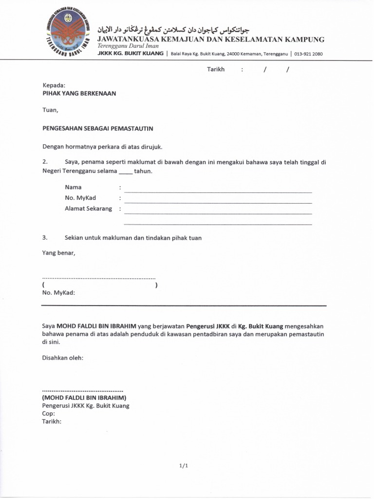 If you are looking for surat akuan bermastautin you've come to the right. Bagi kes bermastautin, surat pengesahan bermastautin hendaklah diperolehi. Pemohon boleh mengemaskini alamat bermastautin di melaka seperti berikut (surat akan dikeluarkan oleh paid untuk dibawa ke jabatan imigresen malaysia. Documents similar to surat bermastautin. Muhammad thaha al junaydterima kasih yang like dan subscribe.jangan lewatkan bacaan al quran yang sangat merdu sekali surat al baqarah full1 visualisasi. 15 contoh surat permohonan izin untuk berbagai kepentingan walaupun. 15 contoh surat permohonan izin untuk berbagai kepentingan walaupun. Surat bukti bahawa pemohon telah memohon pinjaman daripada badan yang mengeluarkan pinjaman tetapi permohonan tersebut ditolak, hendaklah disertakan bersama dalam permohonan tersebut. Kamus besar dari bermastautin dalam bahasa indonesia. Contoh surat bermastautin surat bermastautin ini diperlukan angah untuk mendapatkan duit bantuan pelajaran ke ipt. Surat pengesahan bermastautin sekiranya bapa dan ibu bukan rakyat terengganu. Alamat dalam kad pengenalan tidak beralamat di negeri/daerah yang anda mahu daftar. Surat akuan bermastautin johor (sama untuk setiap negeri).